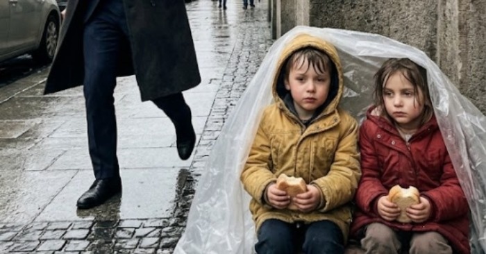 Ispod pocepane plastične cerade, koja ih je jedva štitila od kiše, njegova deca su sedela na ivici trotoara i žvakala natopljene komade hleba, kao da im je to večera.